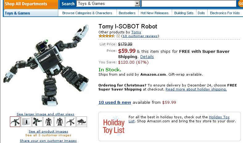 This page is for my E-mail subscribers who, like myself, missed out on the incredible deal Amazon had on brand spanking new i-SOBOT robots for $59 USD, on 12-3-2008. Over 500 new i-SOBOT robots sold at that price in less than 20 minutes. Fortunately I captured a snapshot of the Amazon page so others can see it for themselves, and cry along with me at the lost opportunity!