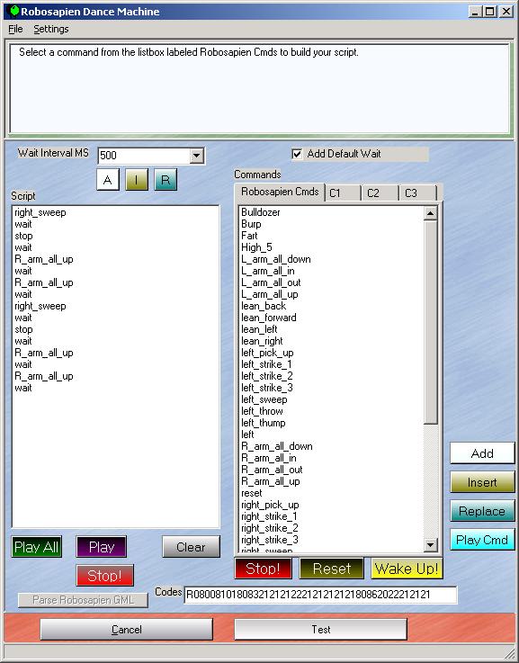 To make my Robosapien robots dance and act, I needed a way to script the commands normally issued by the remote control in a much more effective and complex manner. I wrote a piece of software, The Robosapien Dance Machine, to give me full script editing capabilities. In essence it is a word processor for Robot control. With the addition of an adjustable WAIT command and creative use of the Robosapien STOP command, I was able to synthesize new movements that timed well to a 120 beats per minute song. I used the UIRT, a USB driven infrared transceiver made by Jon Rhees, to control my robots from my PC without the need for the remote control. Below is a screen shot of the main screen. The software is an open source project hosted on SourceForge.