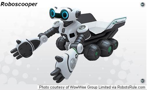 Roboscooper can move left, right, forward and backwards and even makes beeping noises like a dump truck when going in reverse. It has four infrared sensors for object detection and obstacle avoidance. One he has picked up an object, he can pivot his torso to drop the object in his cargo bay. If an object is too large or too heavy to be handled, he will play a message to let you know he needs help. For a really funny experience, you can put him in “whack” mode and he will smack objects that get in his way.