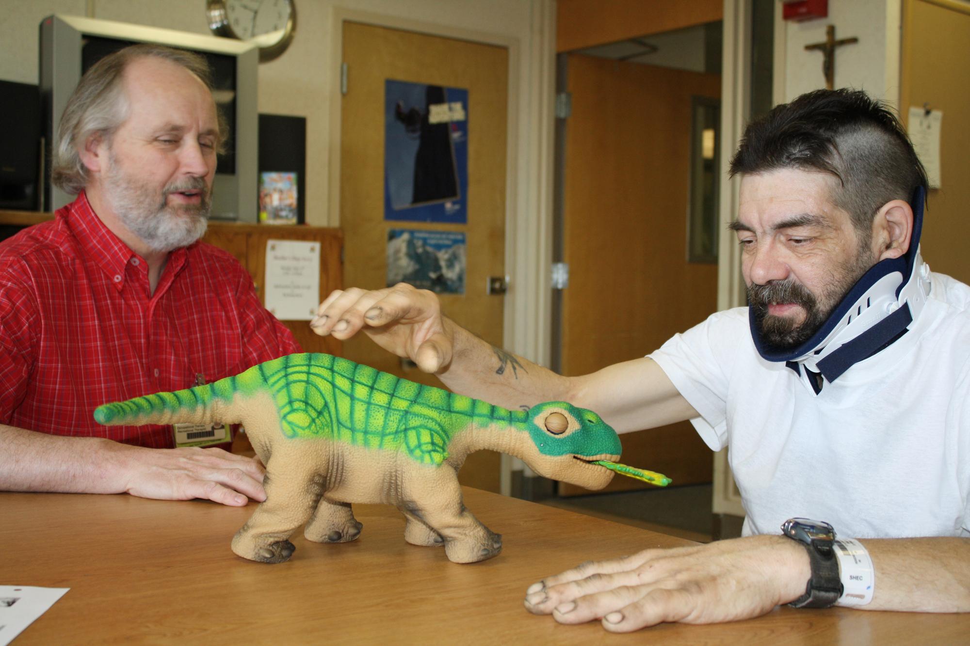 We all need a friend some time, and after a life threatening accident that leaves your body broken, unable to move properly, a friend can be the best medicine possible. Especially a cute little green baby dinosaur so adorable that you can't help yourself from petting. Sacred Heart hospital has a new 3 and a half pound bouncing baby staff member named Pleo. The hospital discovered that Pleo is a heck of a companion and surprisingly, also a form of fun that is therapeutic both to body and soul. We all know the power of a good pet to brighten our day and no greater testament to Pleo's ability to do that comes from Gary Sandvig who said "I would talk to it and hold onto it, much like I do with my own pet Diesel. He interacted with me. In a way, he kind of took the place of my dog." Gary, who suffered a spinal cord injury in a motorcycle crash, has difficulty in using his hands. It would be expected that a funny responsive little guy like Pleo would help lift his spirits, but what surprised Gary and the hospital staff is that playing with Pleo helped build strength in one of his hands while petting him. Most importantly, it was fun so it didn't feel like therapy.