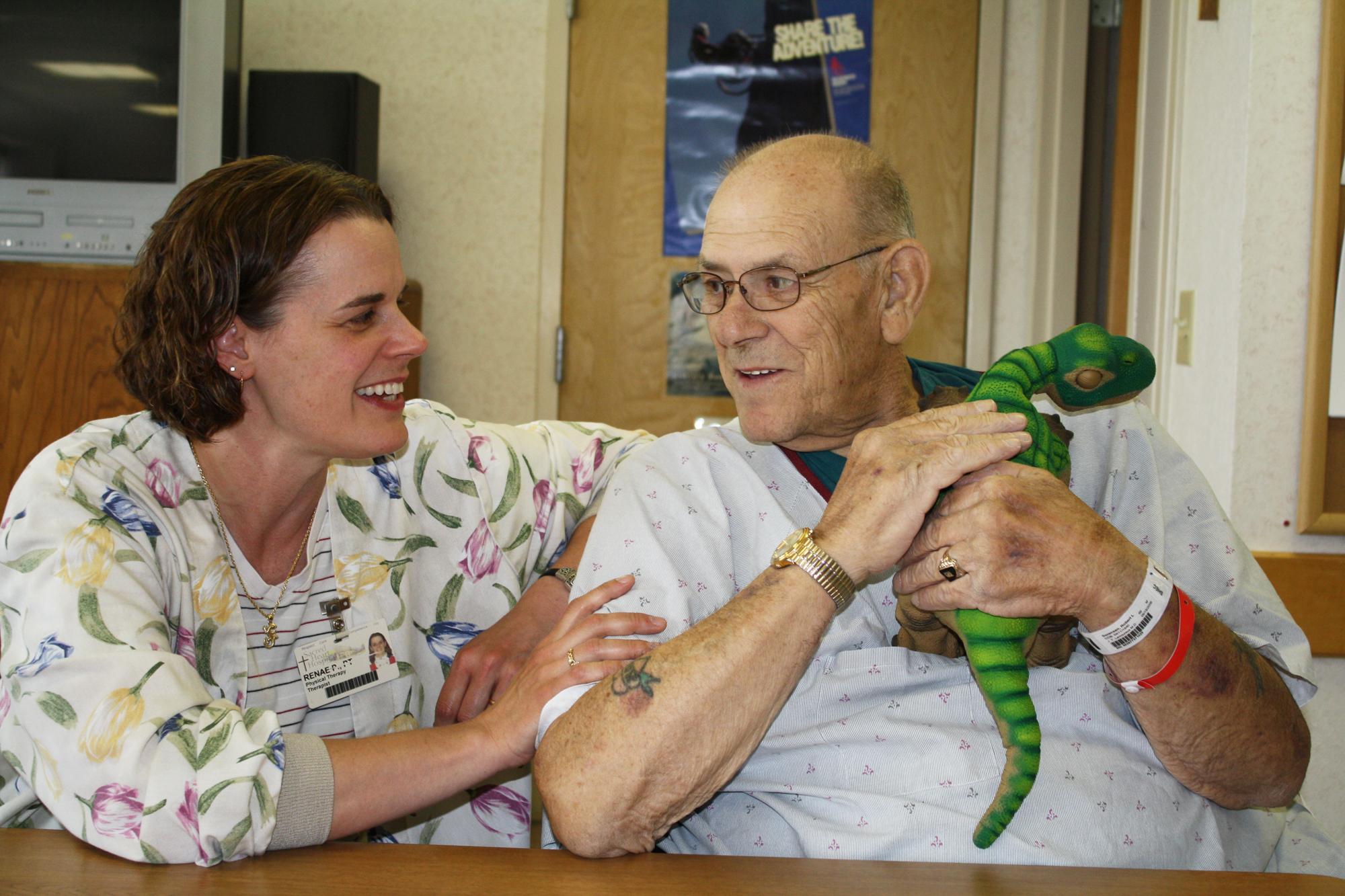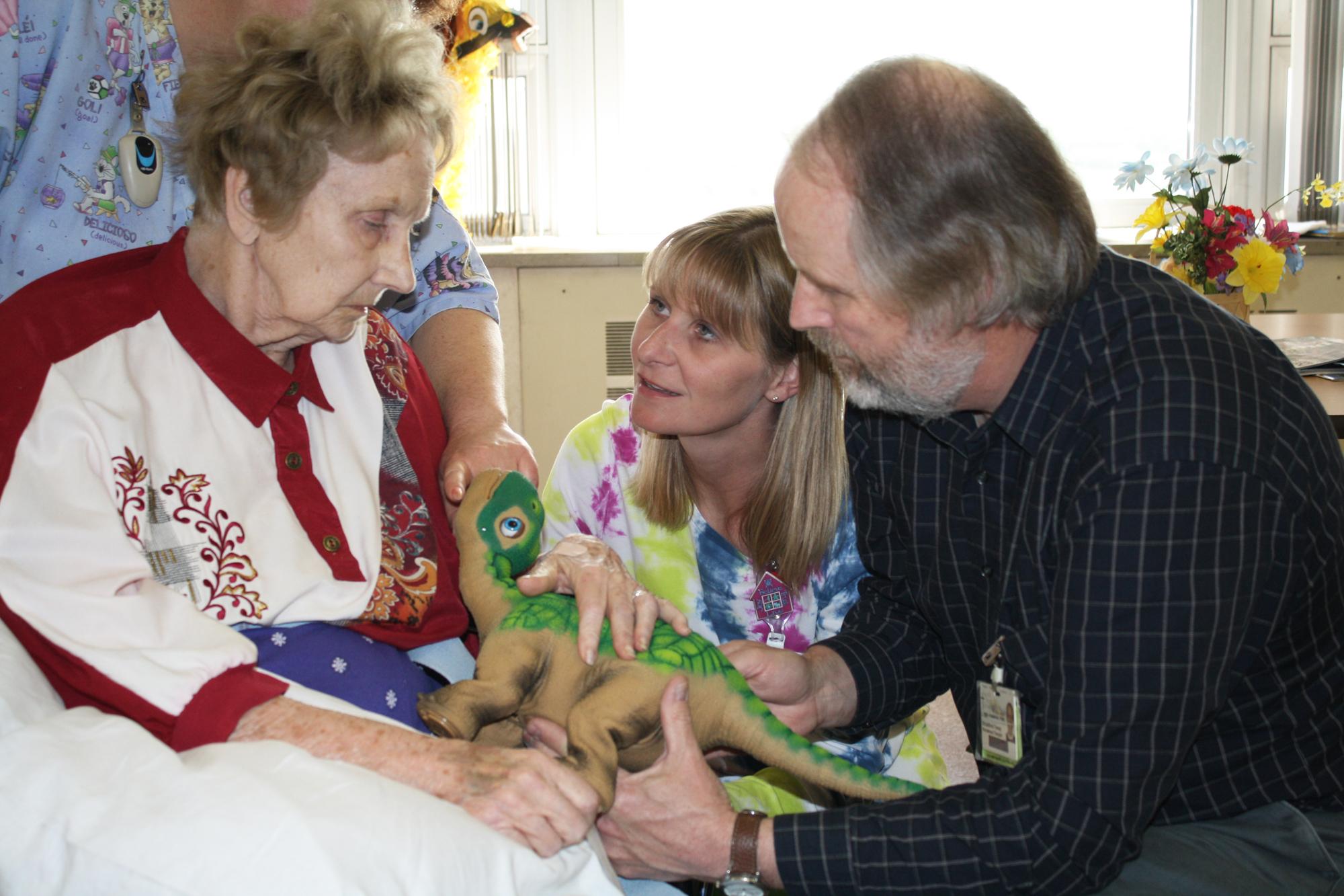 But no words can describe the elation at seeing real people in need getting real comfort from Pleo as the pictures on this page clearly show. Take a moment to enjoy them and definitely click on each of them to see them full size. A big giant double thumbs up goes out to Sacred Heart hospital for having the vision to try innovative alternative therapies for their patients and for caring enough about them to give Pleo a try, and in the process, make believers out of all of us that Pleo is indeed good medicine. When you're done here, click on the link below to visit PleoWorld and learn more about this charming and amazing little robotic companion that can bring smiles and real health benefits to the people we love. Make sure you read the complete article from Sacred Heart and read in their own words their appreciation for Pleo and what he has done for their patients.
