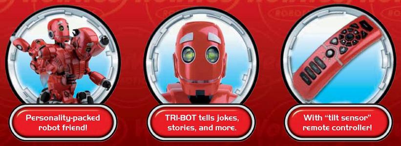 Complete with built-in games Tri-Bot is a joke telliing interactive robot that is the latest in WowWee's family of personal robotics. You can play games with him such as Pattern, Minefield, or Maze where you guide his movements and help him to succeed. with a unique three wheeled mobile base Tri-Bot has complete movement in all directions. In a manner similar to Nintendo's ever popular Wii remote control (WiiMote), the Tri-Bot remote allows you to control his movements by tilting the remote control. Advanced tilt sensors in the remote sense the motion of your hand and converts it to infrared commands the robot understands.